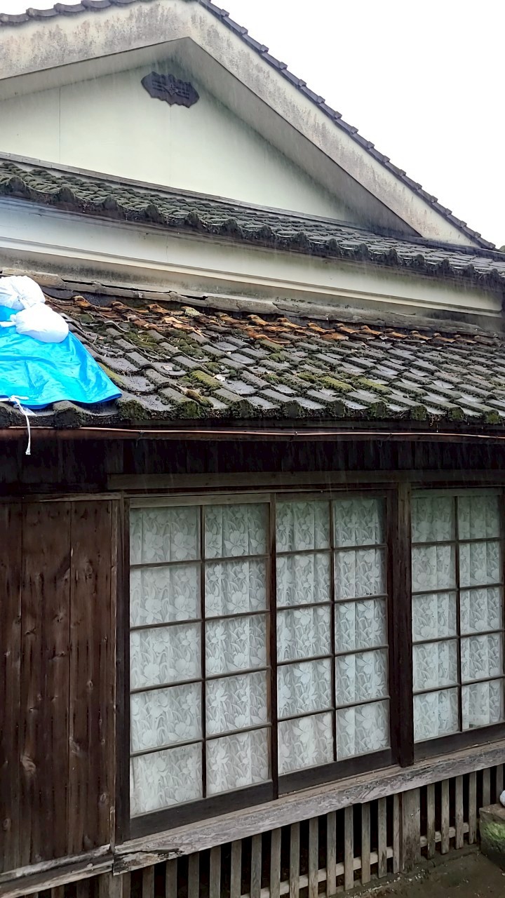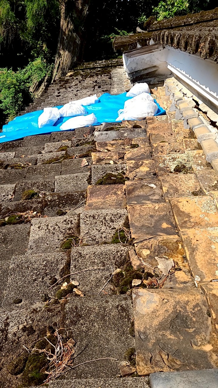 「雨漏りがするので見てほしい」とご連絡いただきました。瓦の破損がひどいので、葺き替えをご提案させていただきましたが、取り壊して建替えるご予定があるということでしたので、応急処置でシート養生をしました。