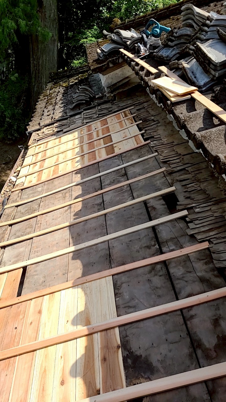 「雨漏りがするから見てほしい。屋根から落ちる雨漏りはバケツを置いてあり、これから梅雨に入るので心配」とご連絡いただきました。瓦を一部はいで点検してみるとルーフィングの破れ、野地板の腐れを確認できました。①野地板補修②ルーフィング、瓦桟打ち…