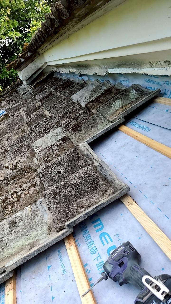 雨漏りで天井にシミが出来ているとお客様よりご相談いただきました。長年の劣化で瓦が破損しているのと強風でずれがみられました。1度雨漏り周辺の瓦をはぎ、水漏れをブロックする下葺き材を敷き、割れた瓦のみを新しい瓦へ交換しました。