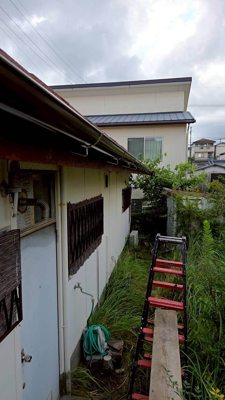 「雨樋にゴミ・灰が積もり草が生えてきて雨がうまく流れないのでお掃除をしてほしい。」とご連絡いただきました。点検にお伺いすると、今はどなたも住んでいらっしゃらない建物ですが、雨樋の雨が草が邪魔をしてお隣さんにご迷惑をおかけしそう…と心配され…